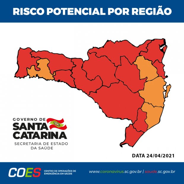 A Matriz de Risco Potencial divulgada neste sábado, 24, pelo Governo de Santa Catarina e Secretaria de Estado da Saúde (SES) aponta que houve uma melhoria de classificação em quatro das 16 regiões avaliadas.