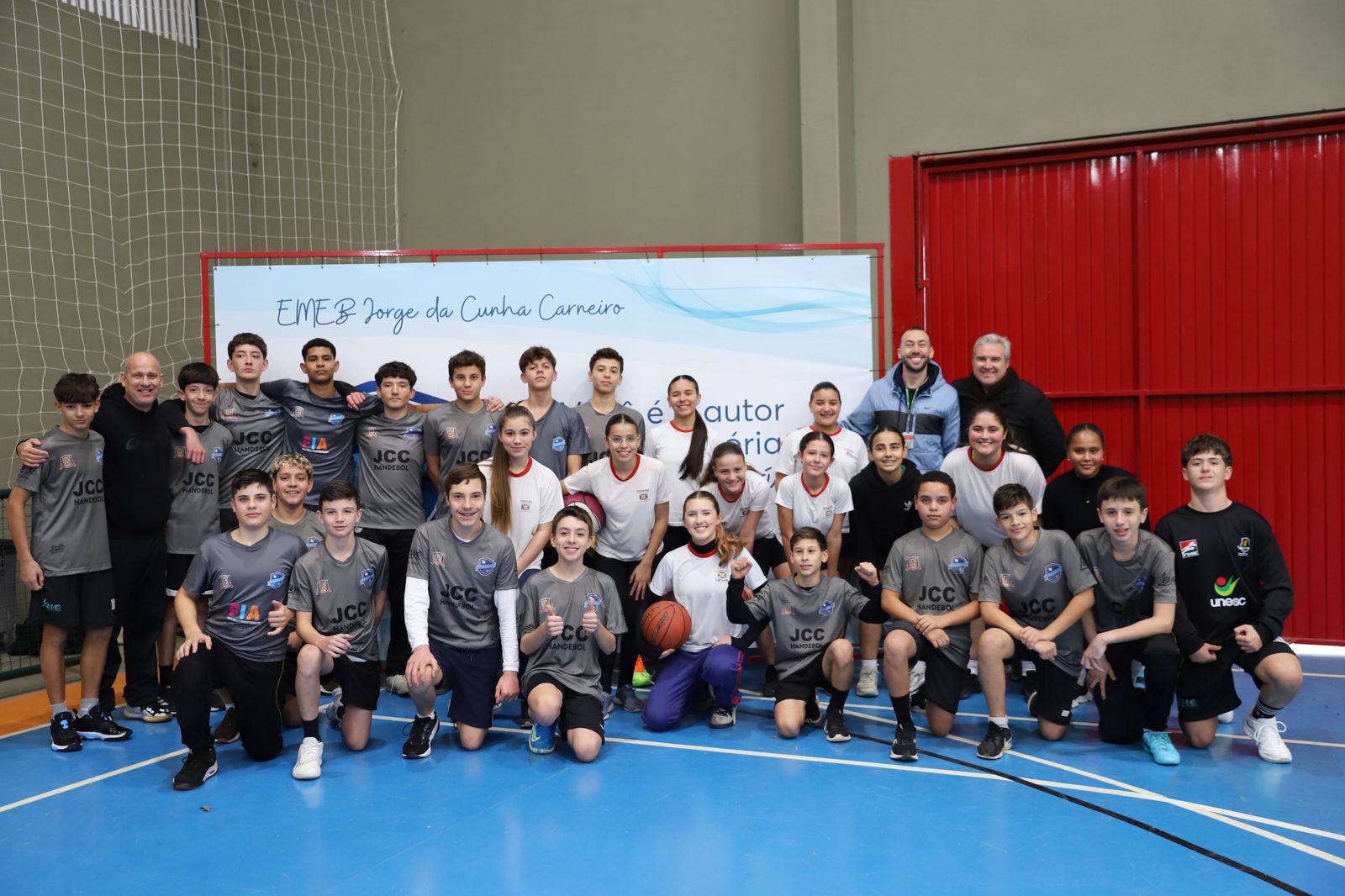 Pela primeira vez na história, uma escola da Rede Municipal de Ensino de Criciúma classificou duas equipes para a fase final dos Jogos Escolares de Santa Catarina (JESC). Os times de basquete feminino e handebol masculino da Escola Municipal de Educação Básica (EMEB) Jorge da Cunha Carneiro, no bairro Próspera, representarão a cidade na categoria de 12 a 14 anos, em Blumenau. Os estudantes viajam nesta quarta-feira (9) e as disputas acontecem de quinta a segunda-feira (10 a 14).