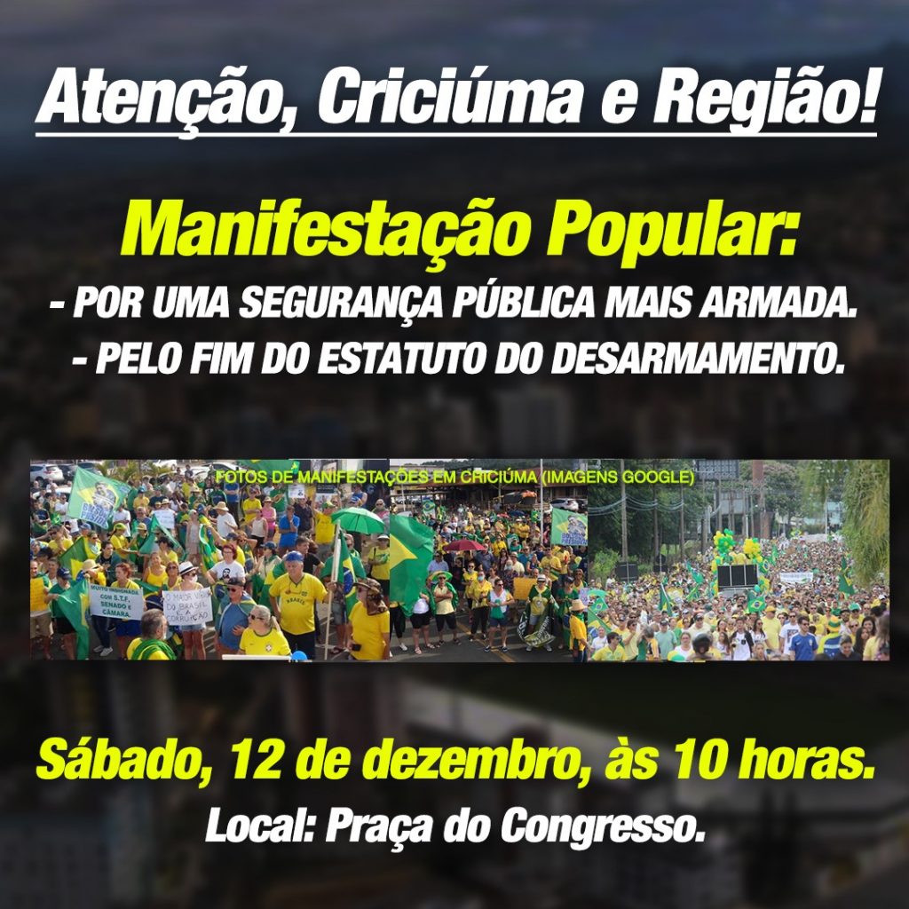 Um ato programado para a manhã deste sábado, na Praça do Congresso, em Criciúma, vai cobrar o Fim do Estatuto do Desarmamento. O movimento também vai cobrar uma Polícia Militar mais bem armada e equipado. Um dos organizadores da manifestação, Pierri Bortoloto explica que o evento surgiu tendo como pano de fundo o terror vivido pela cidade durante o assalto ao Banco do Brasil.