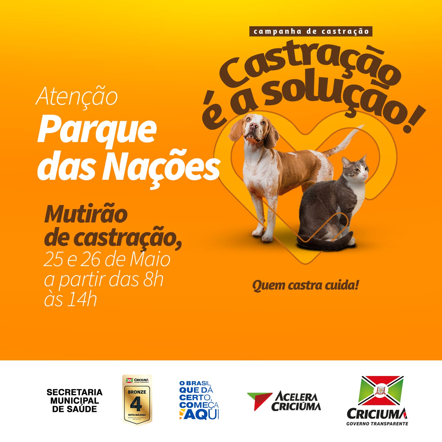 A Prefeitura de Criciúma, através da Secretaria Municipal de Saúde, via Núcleo do Bem-Estar Animal (NUBEA), realizará mais um mutirão da campanha “Castração é a Solução”, que busca reduzir a quantidade de animais em situação de rua em Criciúma. A iniciativa ocorre neste sábado (25) e domingo (26), das 8h às 14h, no Parque das Nações. Serão disponibilizadas 300 vagas, que devem ser pré-cadastradas pelo telefone (48) 99955-6219.