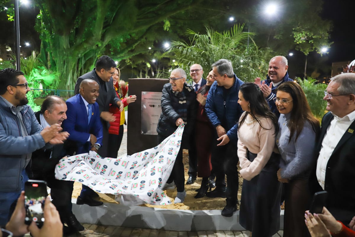 A cerimônia contou com homenagens. O ex-prefeito Clésio Salvaro foi reconhecido pelo compromisso com a revitalização, relembrando a assinatura da ordem de serviço em 2024. O pastor Roberto Ohlweiler, da Assembleia de Deus, recebeu placa pelo cuidado com a praça e destacou a homenagem à missionária Maria Silva Rodrigues, pioneira da evangelização em Criciúma. A deputada Geovania de Sá também foi homenageada pelo apoio à captação de recursos.