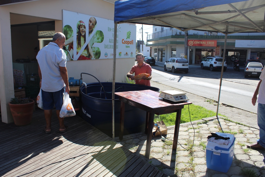 Entre as espécies, os clientes podem escolher entre tilápias e carpas coloridas, criadas há aproximadamente dois anos pelo piscicultor João Miguel Klima. “Tivemos um incentivo fundamental do Governo de Içara para implementar o peixe vivo na Feira da Agricultura Familiar e aguardamos com expectativa a presença da população” relatou Klima.