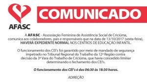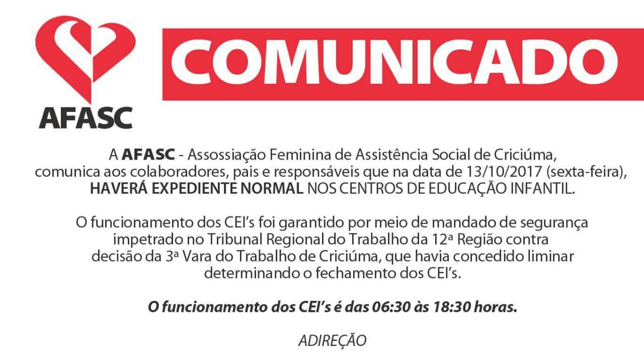A Afasc garantiu, através de um mandado de segurança, o direito de manter o funcionamento das creches da instituição nesta sexta-feira. Em nota oficial, a entidade explicou a situação