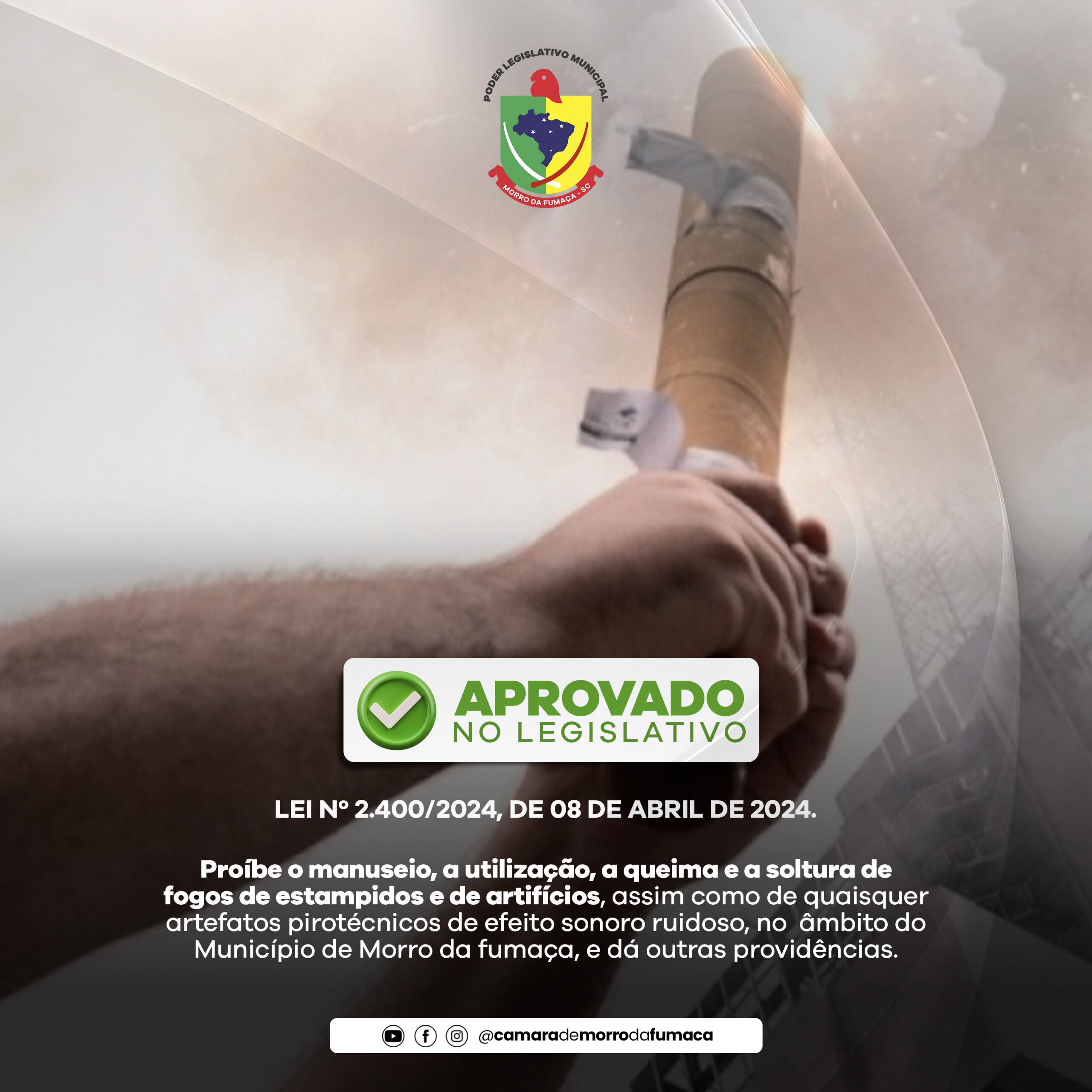 A Câmara Municipal de Morro da Fumaça aprovou por unanimidade o Projeto de Lei nº 03/2023, de autoria da vereadora Silvana de Vasconcelos (PL), que proíbe o manuseio, a utilização, a queima e a soltura de fogos de estampidos e de artifícios, assim como de quaisquer artefatos pirotécnicos de efeito sonoro com ruídos no município.