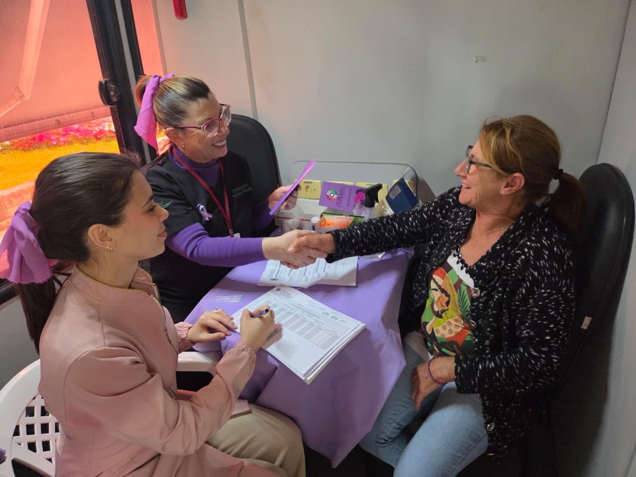 “Fiquei surpresa ao encontrar esse ônibus diferente e com um agito em volta. Cheguei mais perto para ver o que era e já fiquei por aqui. Fiz os exames que precisava, tomei café e recebi orientações. Elas foram maravilhosas comigo”, relatou.