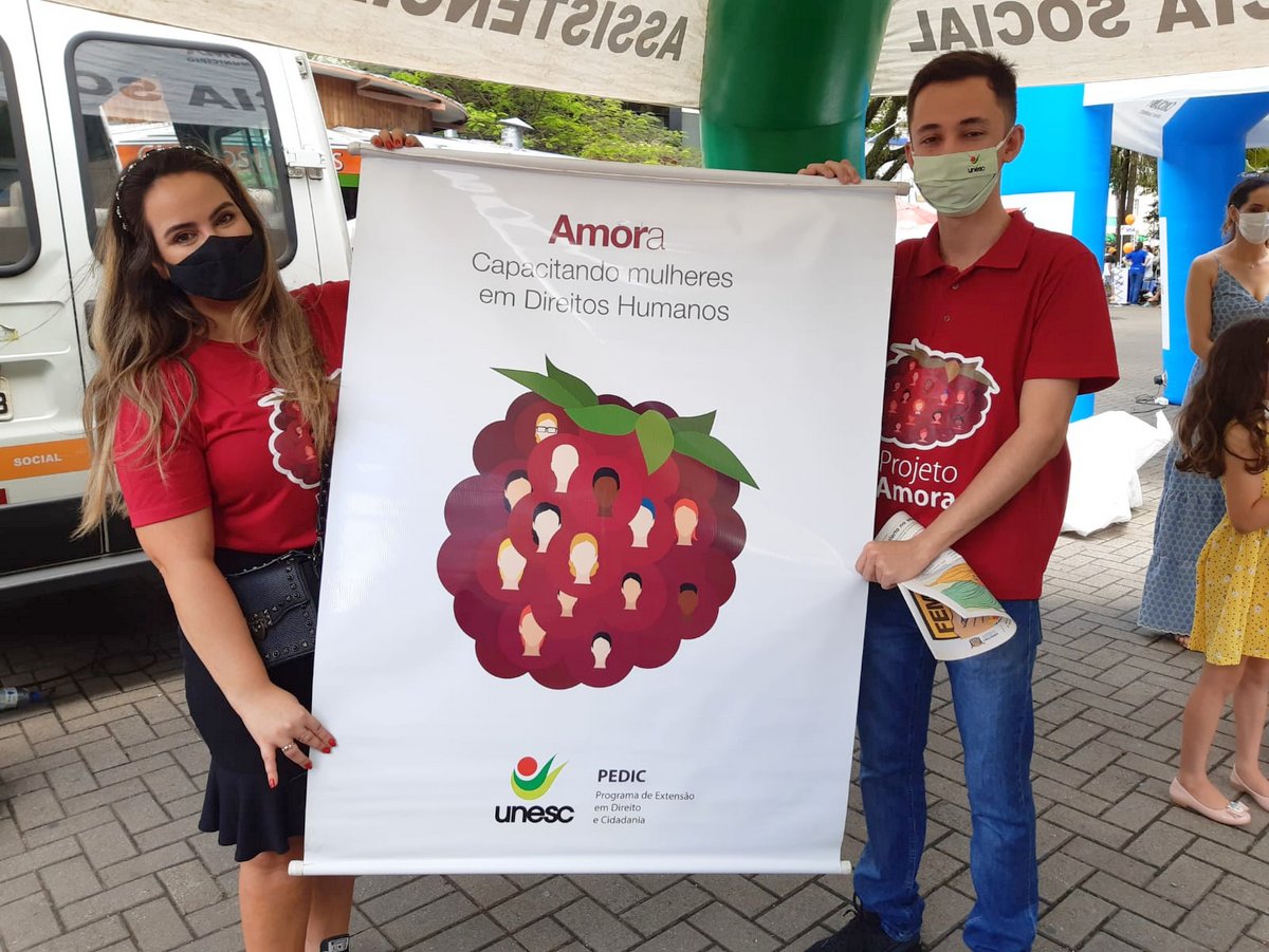 Para marcar o Dia Internacional de Combate à Violência Contra a Mulher, celebrado no último dia 25, professores e acadêmicos da Unesc que fazem parte do projeto de extensão “Amora: Capacitando Pessoas em Direitos Humanos das Mulheres” foram até a praça Nereu Ramos, em Criciúma, para conscientizar e levar conteúdo para as mulheres que enfrentam algum tipo de violência. O evento ocorreu no sábado (27/11), e apresentou como tema “Violência doméstica: você não está sozinha”.