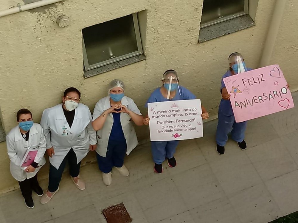 Sem a presença física dos amigos, mas com o objetivo de trazer alegria à jovem, a equipe multidisciplinar preparou uma festa à distância.
