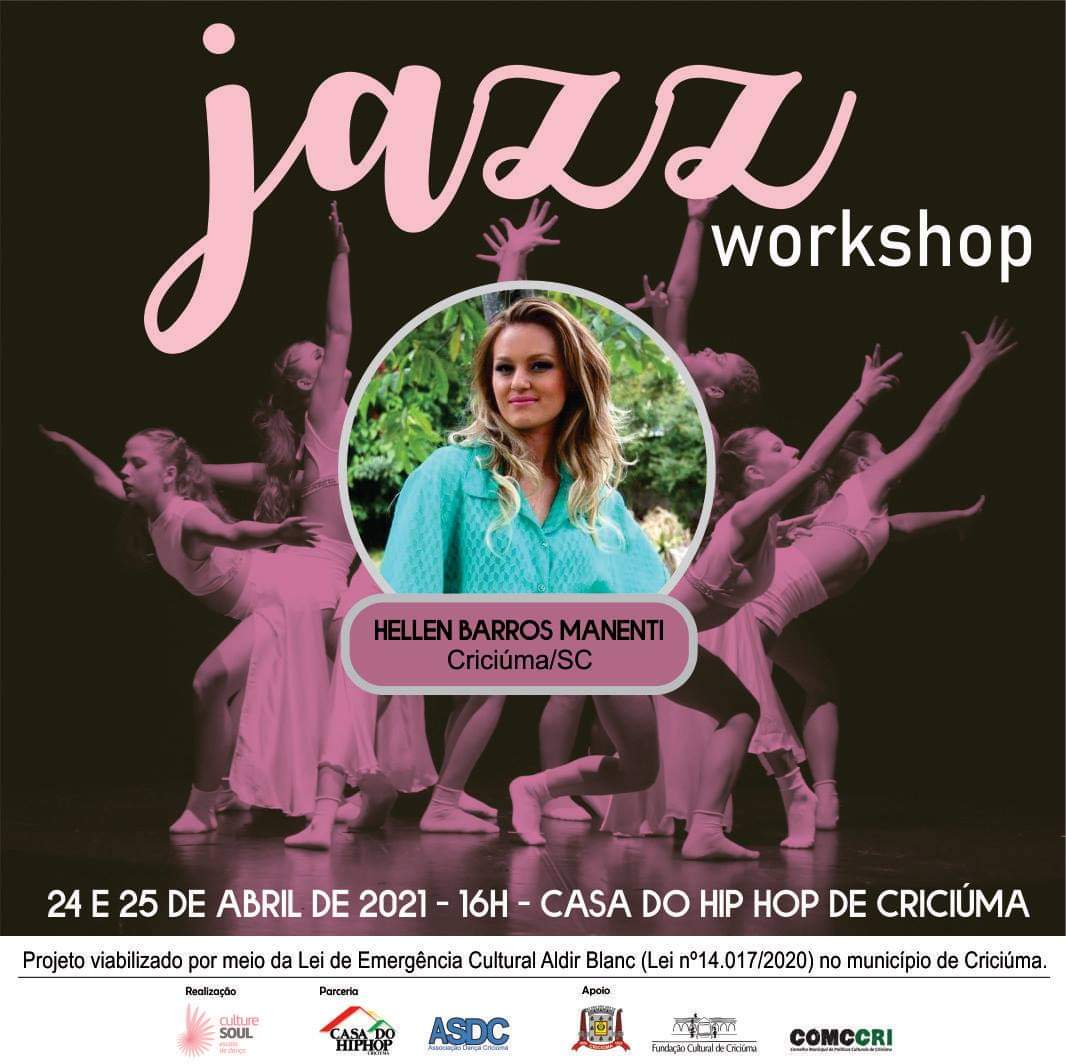 Ocorre neste sábado e domingo (24 e 25), a partir das 16h, na Casa do Hip Hop de Criciúma, o Workshop de Dança Jazz, que faz parte do projeto Mostra Coreográfica da Culture Soul/Escola de Dança, que foi aprovado pela Lei Aldir Blanc n°14.017, em edital da Fundação Cultural de Criciúma (FCC). As duas aulas são gratuitas, limitadas com seis alunos cada. As inscrições devem ser feitas pelo direct do Instagram @casadohiphopcriciuma.